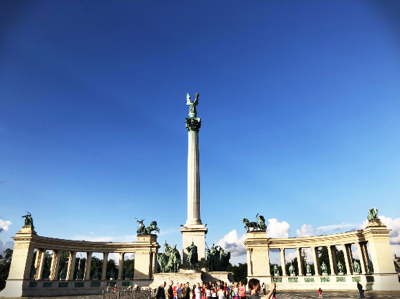 유럽대륙에서 가장 오래되었다는 지하철 M1을 타고 이동하였다. 오래된 지하철을 기념으로 남긴다며 괜히 노란 출입구 앞에서 사진 한 방을 찍고 앞에 멀찌감치 보이는 영웅 광장으로 향하였다. 수학여행 온 듯한 학생들이 영웅 광장의 기념물을 배경으로 열심히 사진을 찍는다.