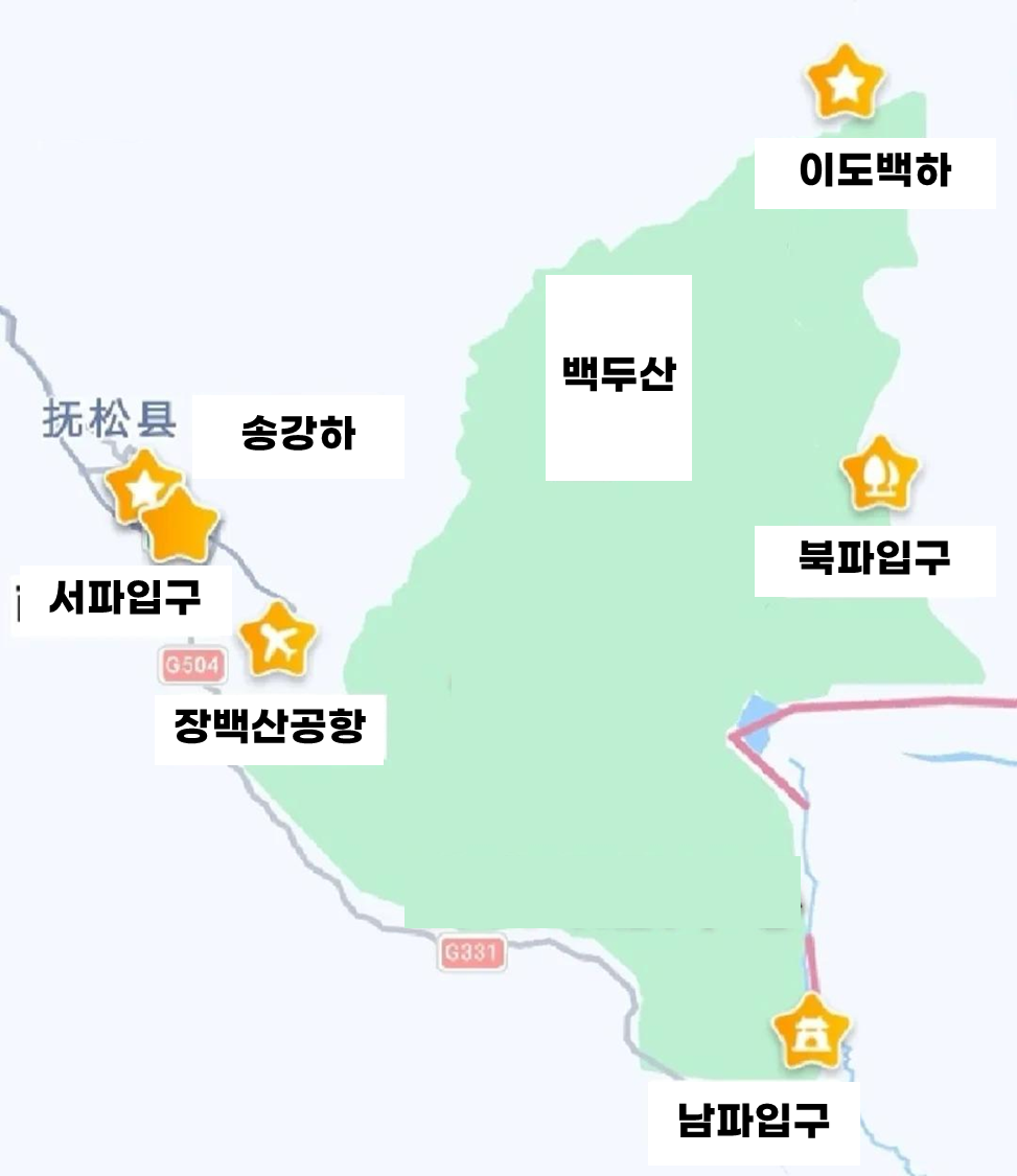 백두산으로 올라가는 길은 세 곳이다. 흔히 북파, 서파, 남파라고 한다. 북파가 까오티에(고속철도) 역인 장백산역이 있어서 가장 접근성이 좋고, 서파는 여기에서 차로 2시간, 남파는 다시 또 2시간 이동해야 하는 거리이다.